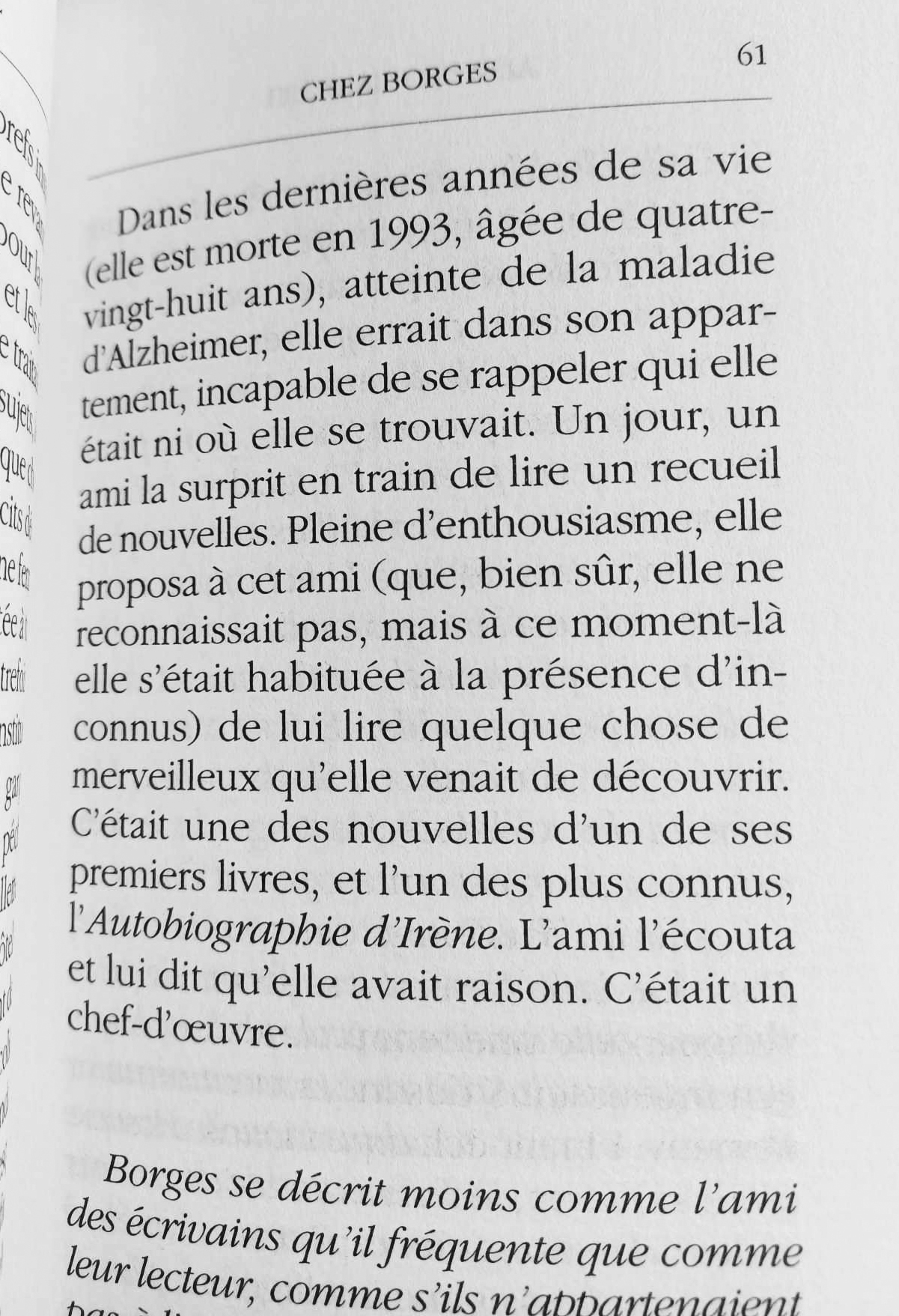 2/ Extrait de «Chez Borges» d’Alberto Manguel (2003) exposé discrètement au coeur de l’exposition «Ressouvenirs», 2025 Translation: “In the last years of her life (she died in 1943 at the age of ninety-eight), suffering from Alzheimer's disease, she wandered around her apartment, unable to remember who she was, nor where she was. One day, a friend caught her reading a collection of short stories. Full of enthusiasm, she offered to tell this friend (whom, of course, she did not recognize, but by this time she had become used to the presence of strangers) something wonderful she had just discovered. It was one of the stories from one of her early books, and one of her best known, Irene's Autobiography. The friend listened and told her she was right. It was a masterpiece.“